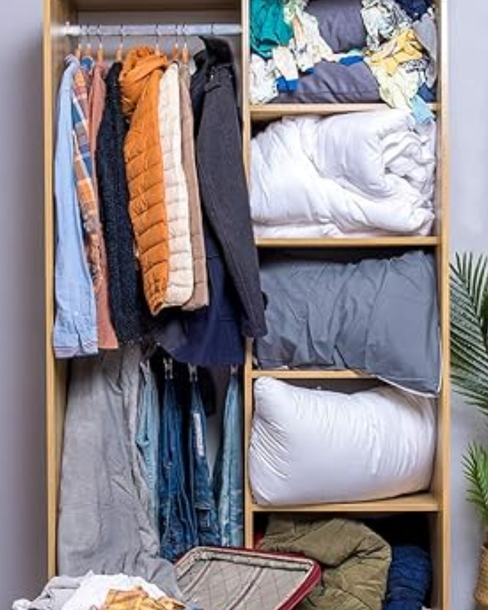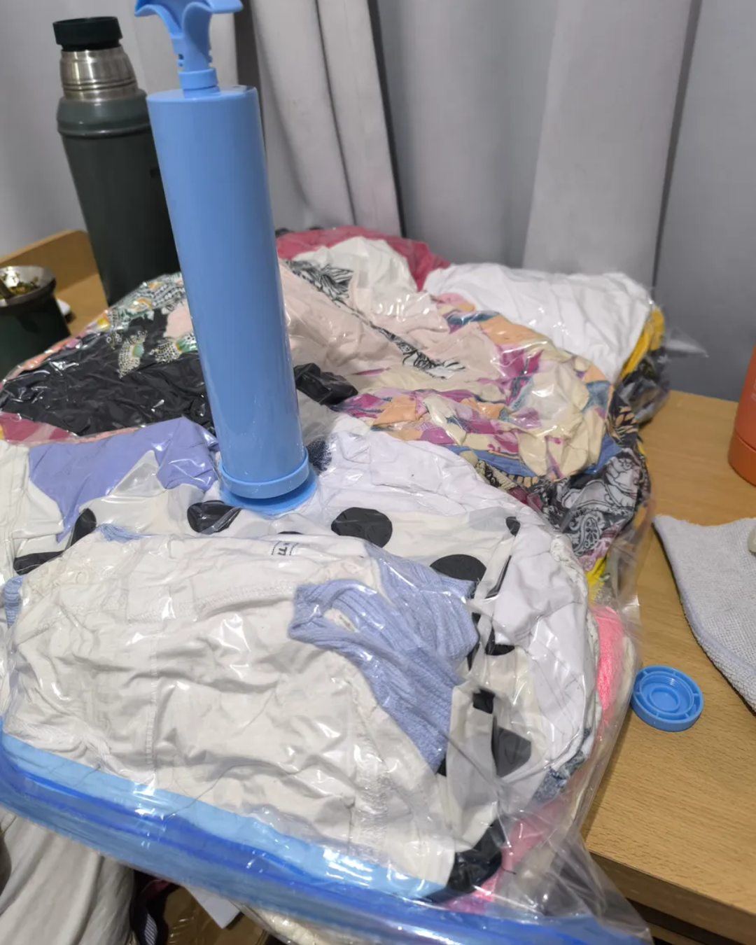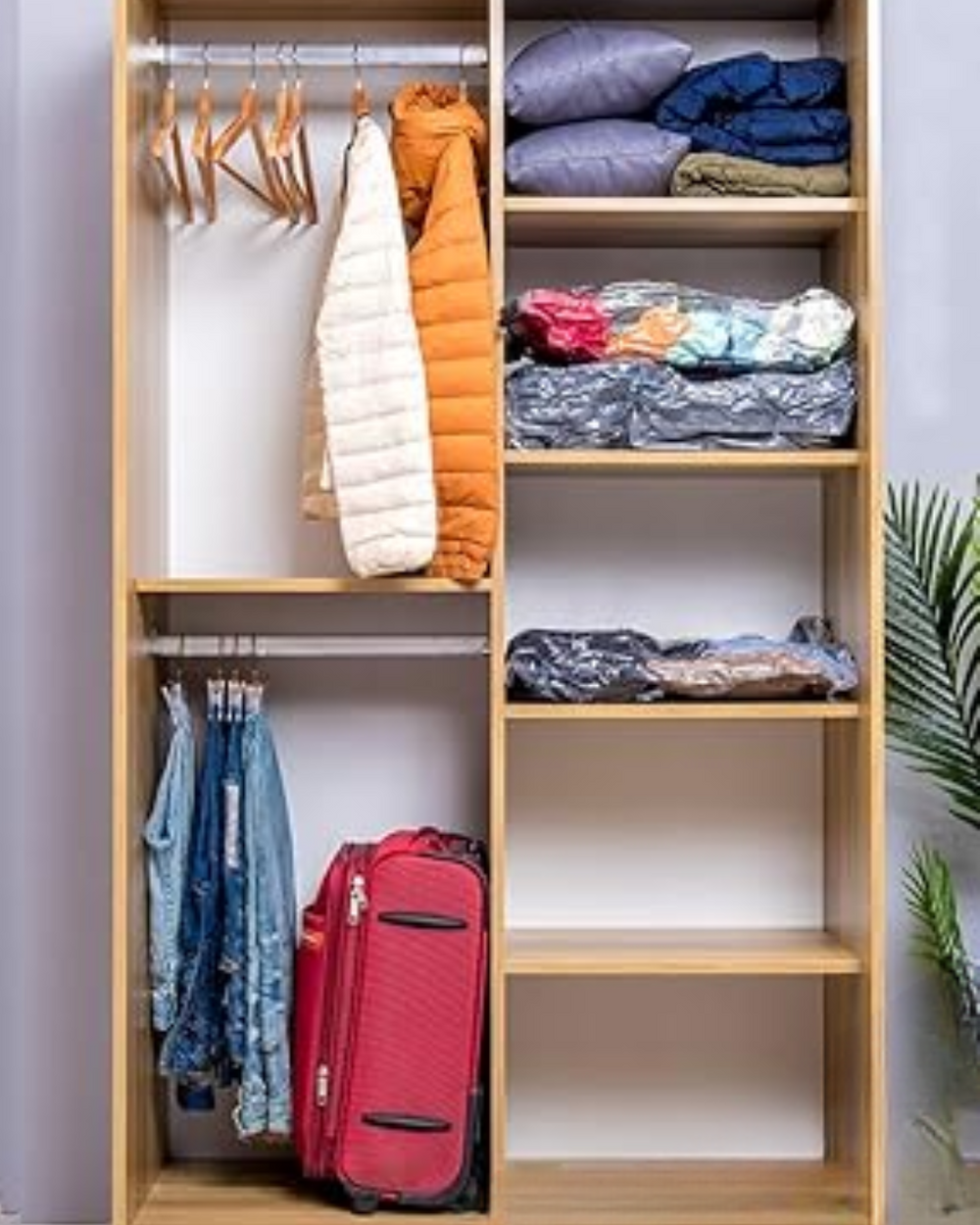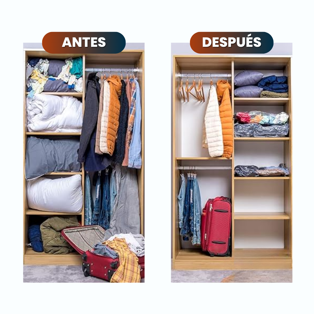 Las frazadas, camperas y ropa de invierno ocupan medio armario y generan desorden visual. Con nuestras bolsas al vacío reducís hasta un 80% el volumen y liberás espacio en segundos.